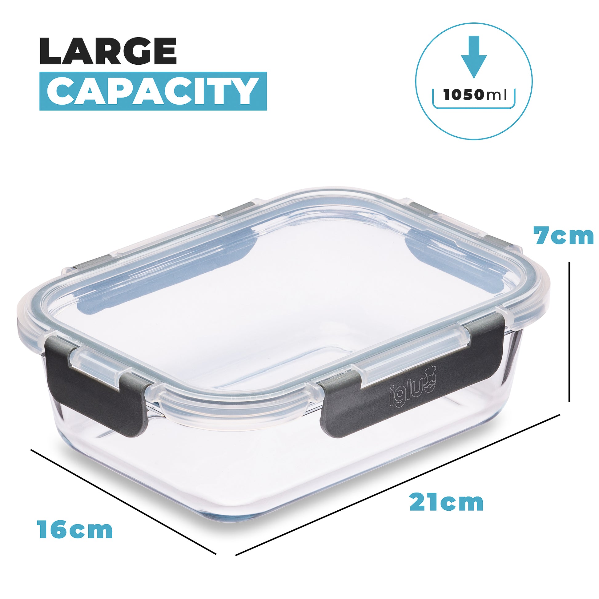 Keep leftovers fresh and family lunches sorted with this large airtight glass container. Volume: 1050ml (35oz) | Dimensions: 21cm x 16cm x 7cm | Material: Borosilicate glass